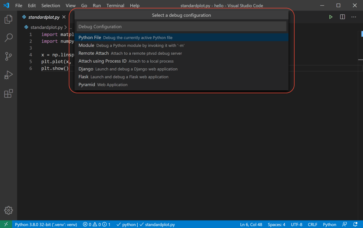 如果需要對(duì)Python語(yǔ)言進(jìn)行設(shè)置,在彈出的Select a debug configuration中選擇Python File,其他語(yǔ)言操作類似。如下圖所示: