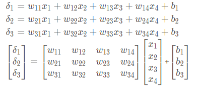 每張圖片總共4個(gè)像素點(diǎn),我們可以看作是4個(gè)feature,假設(shè)這三類小動(dòng)物的圖片線性可分,每一類對(duì)應(yīng)一組weight和一個(gè)bias。