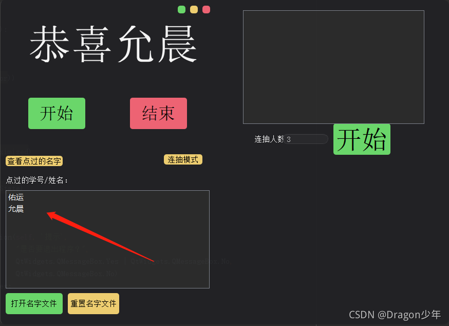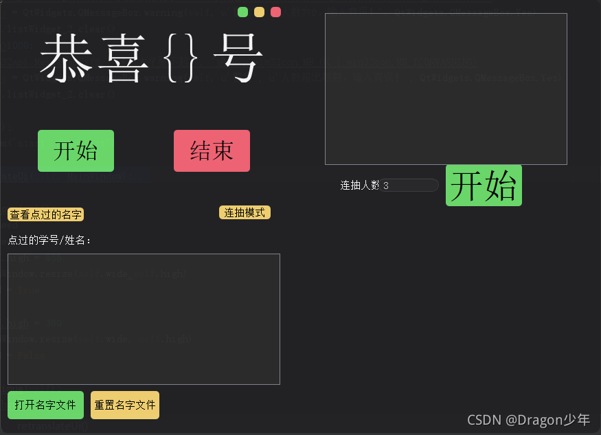 # author:Dragon少年 # 點擊“查看點過的名字”時,調用該函數,對界面窗體高度大小進行resize重置 def showHistory(self): global seed if not seed: self.high = 656 MainWindow.resize(self.wide,self.high) seed = True else: self.high = 360 MainWindow.resize(self.wide, self.high) seed = False # 點擊“連抽模式”時,調用該函數,對界面窗體寬度大小進行resize重置 def showContinue(self): global choud if not choud: self.wide = 874 MainWindow.resize(self.wide, self.high) choud = True else: self.wide = 420 MainWindow.resize(self.wide, self.high) choud = False