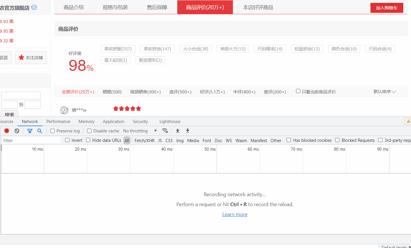 接下來重頭戲,F(xiàn)12 打開 開發(fā)者工具,選擇 Network,然后點(diǎn)擊全部評(píng)價(jià),抓取數(shù)據(jù)包。