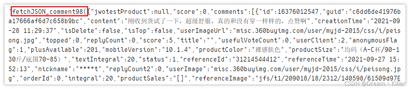 數(shù)據(jù)是獲取了,但前面多了一些沒用的字符(后面也有),很明顯不能直接轉(zhuǎn)成 json 格式,需要處理一下。