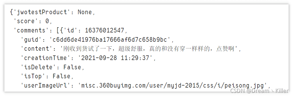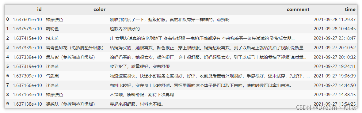 現(xiàn)在數(shù)據(jù)格式處理好了,可以上手解析數(shù)據(jù),提取我們所需要的部分。這里我們只提取 id(評(píng)論id)、color(產(chǎn)品顏色)、comment(評(píng)價(jià))、time(評(píng)價(jià)時(shí)間)。