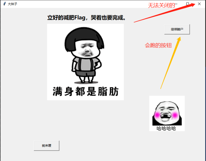 question = "立好的減肥Flag,哭著也要完成。" yes = "就來噯" no = "繼續(xù)躺尸" title = "大妹子"