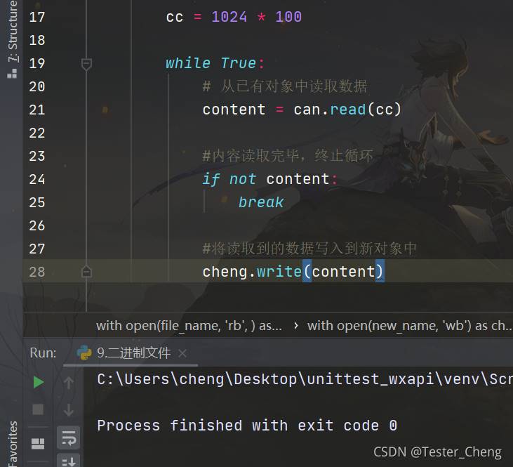 file_name = "C:/Users/cheng/Desktop/can.jmx" with open(file_name, 'rb', ) as can: # 定義一個(gè)新的文件 new_name = 'to.jmx' with open(new_name, 'wb') as cheng: # 定義每次讀取的大小 cc = 1024 * 100 while True: # 從已有對象中讀取數(shù)據(jù) content = can.read(cc) #內(nèi)容讀取完畢,終止循環(huán) if not content: break #將讀取到的數(shù)據(jù)寫入到新對象中 cheng.write(content)