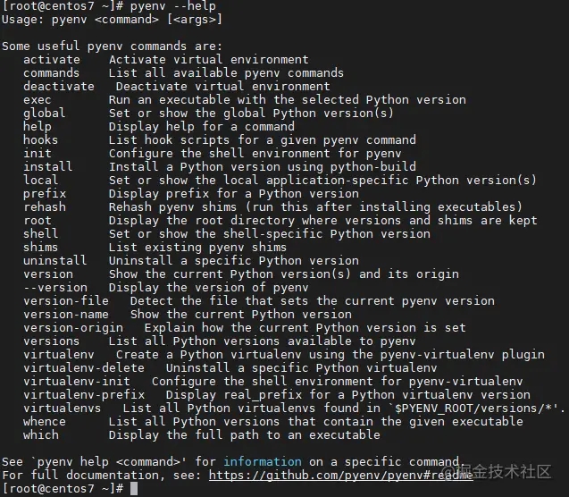 至此沒有報(bào)錯(cuò)的話,pyenv就安裝完成了,我們可以通過下面的命令驗(yàn)證pyenv是否正確安裝以及獲取pyenv的幫助信息: