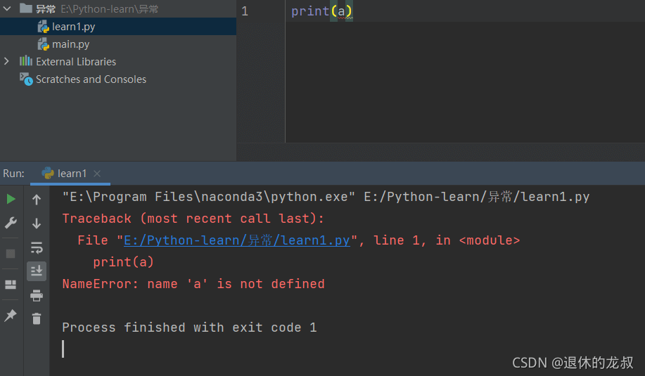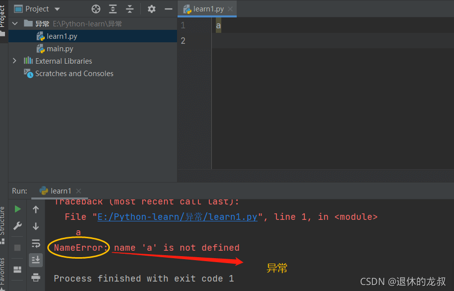 例如我在代碼中只寫了一個(gè)變量a,運(yùn)行程序,pycharm無法識別這個(gè)變量,所以報(bào)錯(cuò),便是出現(xiàn)了異常。