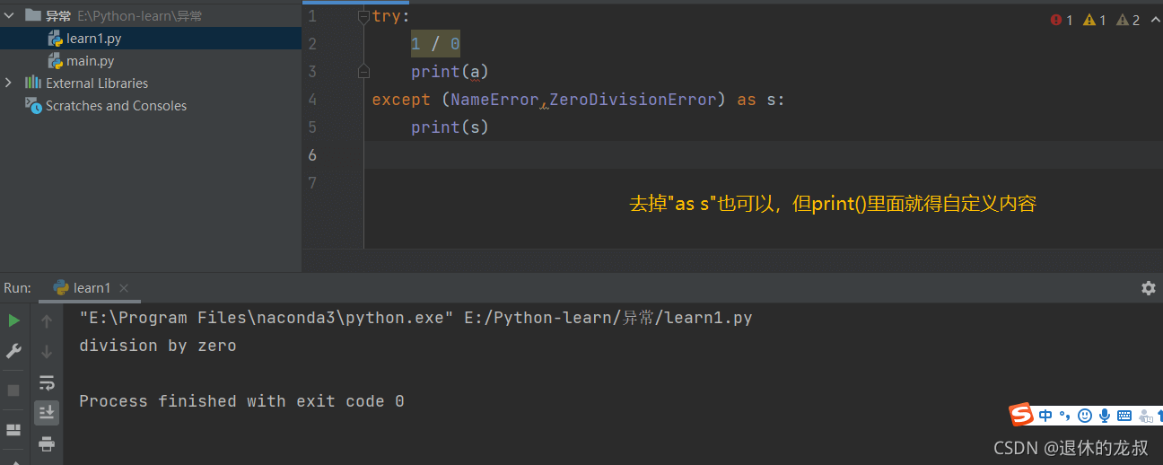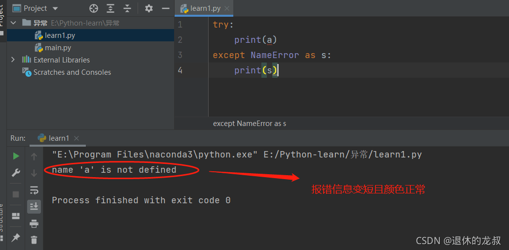 except NameError as s: # 第一種寫法,用as+變量