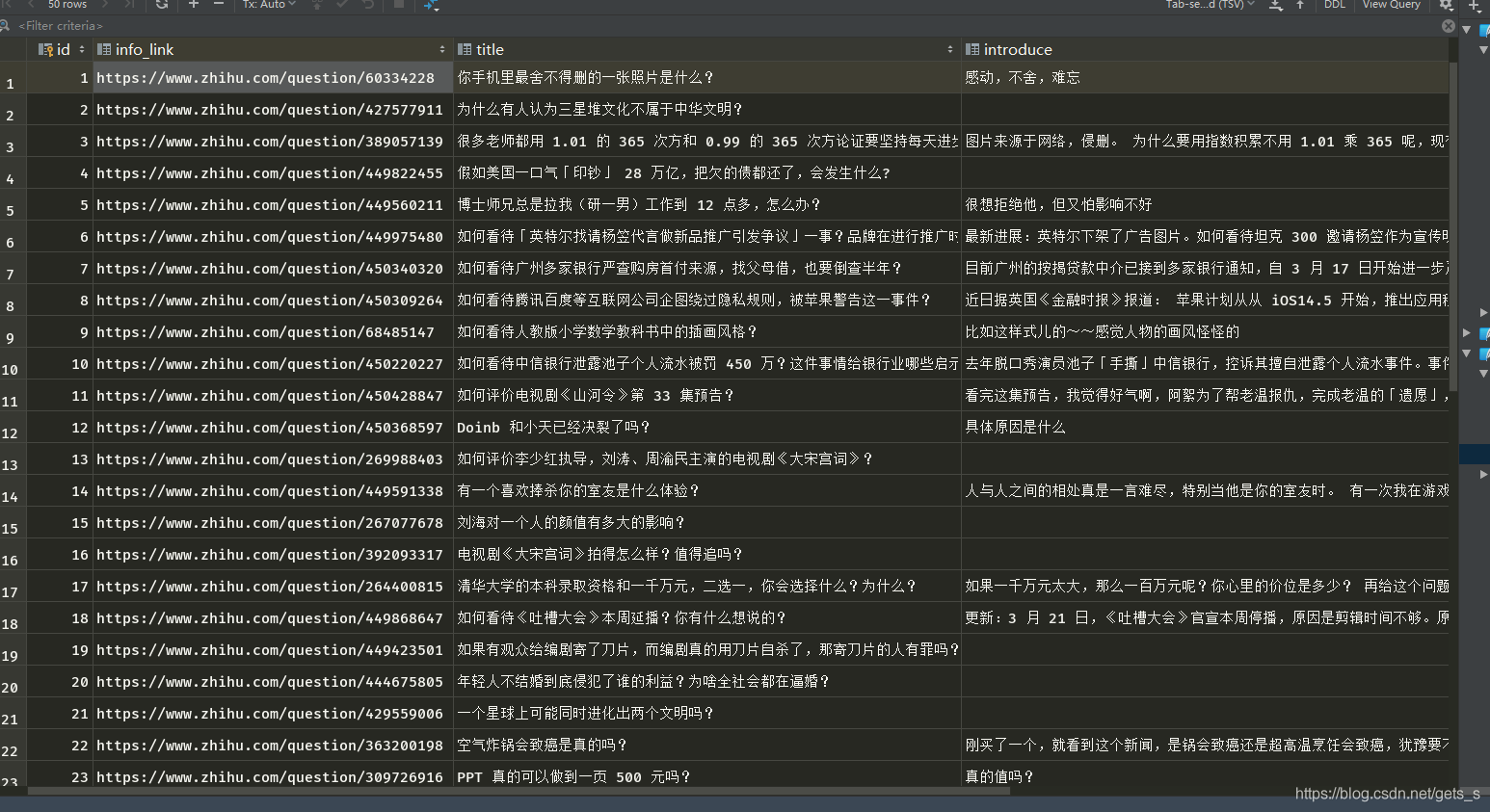 #正則表達式 findlink = re.compile(r'<a class="css-hi1lih" href="(.*?)" rel="external nofollow" rel="external nofollow" ') #問題鏈接 findid = re.compile(r'<div class="css-blkmyu">(.*?)</div>') #問題排名 findtitle = re.compile(r'<h1 class="css-3yucnr">(.*?)</h1>') #問題標題 findintroduce = re.compile(r'<div class="css-1o6sw4j">(.*?)</div>') #簡要介紹 findscore = re.compile(r'<div class="css-1iqwfle">(.*?)</div>') #熱門評分 findimg = re.compile(r'<img class="css-uw6cz9" src="(.*?)"/>') #文章配圖