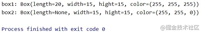 box = Box(20, 15, 15) print(box) # 結(jié)果輸出為 Box(length=20, width=15, hight=15)