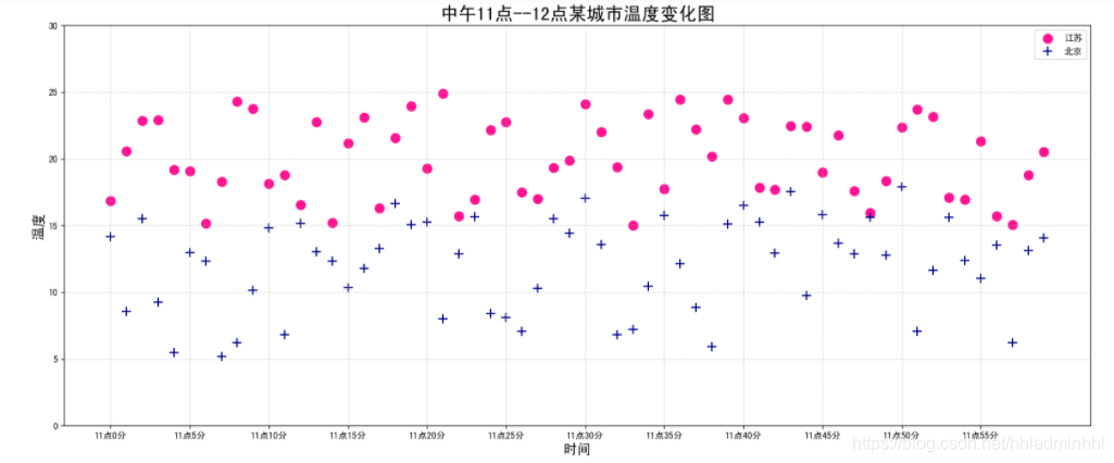 plt.title("中午11點(diǎn)--12點(diǎn)某城市溫度變化圖", fontsize=20)