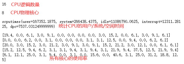 import psutil # CPU邏輯數(shù)量 psutil.cpu_count() # CPU物理核心 psutil.cpu_count(logical=False) # 統(tǒng)計(jì)CPU的用戶/系統(tǒng)/空閑時(shí)間 psutil.cpu_times() # interval:每隔0.5s刷新一次 # percpu:查看所有的cpu使用率 for x in range(5): print(psutil.cpu_percent(interval=0.5, percpu=True))