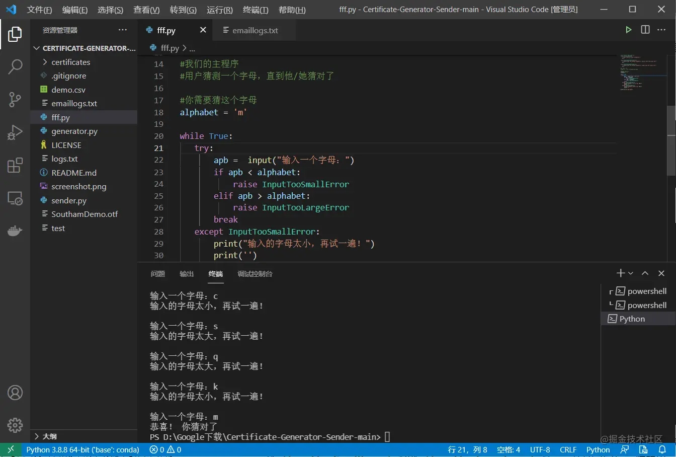 輸入一個字母:c 輸入的字母太小,再試一遍! 輸入一個字母:s 輸入的字母太大,再試一遍! 輸入一個字母:q 輸入的字母太大,再試一遍! 輸入一個字母:k 輸入的字母太小,再試一遍! 輸入一個字母:m 恭喜! 你猜對了