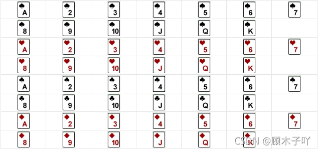 <span style="color:#333333"><span style="background-color:#ffffff"><span style="background-color:#f8f8f8">def getCards(decksNum): cardsList = ['Aa', 'Ab', 'Ac', 'Ad', 'Ka', 'Kb', 'Kc', 'Kd', 'Qa', 'Qb', 'Qc', 'Qd', 'Ja', 'Jb', 'Jc', 'Jd', '0a', '0b', '0c', '0d', '9a', '9b', '9c', '9d', '8a', '8b', '8c', '8d', '7a', '7b', '7c', '7d', '6a', '6b', '6c', '6d', '5a', '5b', '5c', '5d', '4a', '4b', '4c', '4d', '3a', '3b', '3c', '3d', '2a', '2b', '2c', '2d'] cardsList *= decksNum # 牌副數(shù) random.shuffle(cardsList)# 隨機(jī)洗牌 return cardsList</span></span></span>