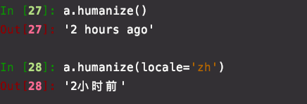humanize 方法是相對于當(dāng)前時刻表示為“多久以前”的一種可讀行字符串形式,默認(rèn)是英文格式,指定 locale 可顯示相應(yīng)的語言格式。