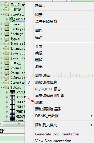 找到數(shù)據(jù)庫里functions包下需要調(diào)試的函數(shù)或存儲過程,然后選中這個(gè)函數(shù)(或存儲過程),單擊右鍵,出現(xiàn)如下圖所示,選中測試功能,進(jìn)入調(diào)試模式。