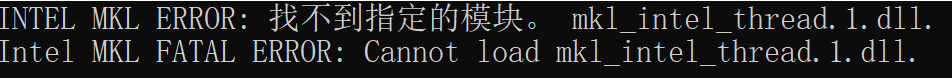 2.打包完運行后控制臺顯示"找不到指定模塊。mkl_intel_thread.l.dll",圖示如下: