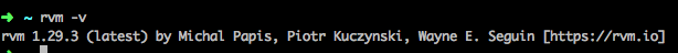 Downloading https://github.com/rvm/rvm/archive/1.29.3.tar.gz Downloading https://github.com/rvm/rvm/releases/download/1.29.3/1.29.3.tar.gz.asc Found PGP signature at: 'https://github.com/rvm/rvm/releases/download/1.29.3/1.29.3.tar.gz.asc', but no GPG software exists to validate it, skipping. Installing RVM to /Users/echen1/.rvm/Adding rvm PATH line to /Users/echen1/.profile /Users/echen1/.mkshrc /Users/echen1/.bashrc /Users/echen1/.zshrc.Adding rvm loading line to /Users/echen1/.profile /Users/echen1/.bash_profile /Users/echen1/.zlogin. Installation of RVM in /Users/echen1/.rvm/ is almost complete: * To start using RVM you need to run `source /Users/echen1/.rvm/scripts/rvm`in all your open shell windows, in rare cases you need to reopen all shell windows. * WARNING: '~/.profile' file found. To load it into your shell, add the following line to '/Users/echen1/.bash_profile':