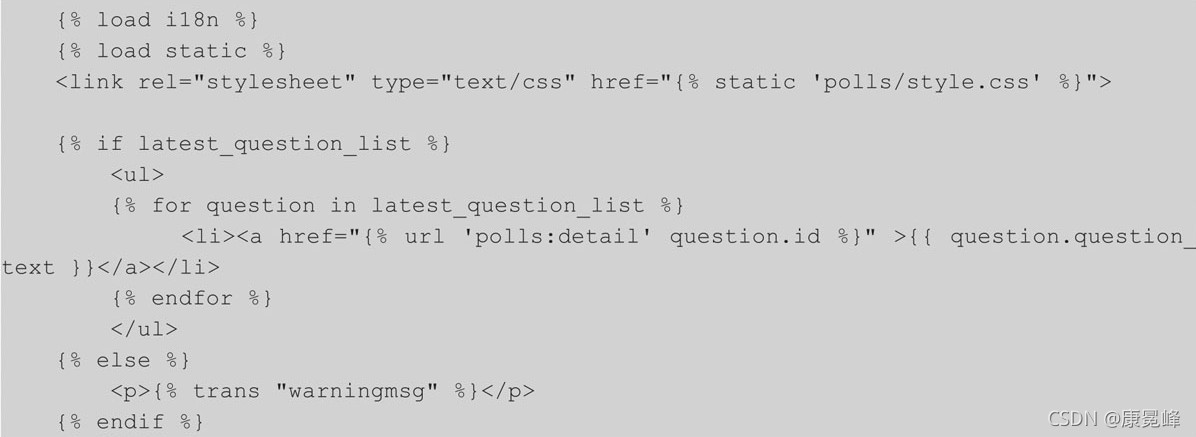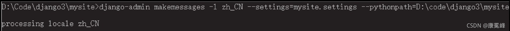 作用:查找整個(gè)源代碼路徑以找出全部翻譯字符串并生成一個(gè)新的消息文件或者更新已有的消息文件。 語法:django-admin makemessages 在介紹代碼示例前,首先修改index.html,增加翻譯字符串:
