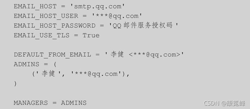 示例:本例以QQ郵件服務(wù)為例講解如何在Django中發(fā)送郵件。在settings.py中設(shè)置QQ郵件服務(wù):