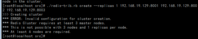 注意:提示最少3個master cluster nodes,前面說是創(chuàng)建6個,但實(shí)際操作我只創(chuàng)建了3個節(jié)點(diǎn),所以可以得出我們創(chuàng)建redis集群是最少三個主節(jié)點(diǎn),而且應(yīng)該是奇數(shù)個,so,不要偷懶,再創(chuàng)建三個吧。