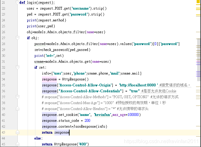 當(dāng)服務(wù)器接收到請求后,會根據(jù)自己的跨域規(guī)則,決定是否同意這次請求,而這個規(guī)則在請求設(shè)置Cookie時就要給定,這里主要要設(shè)置Access-Control-Allow-Origin和Access-Control-Allow-Credentials屬性,Access-Control-Allow-Origin默認(rèn)為‘*',這里需要改成前端ip,Access-Control-Allow-Credentials改為true即可。