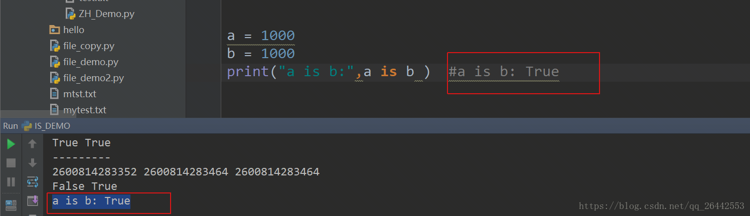 >>> a = 1000 >>> b = 1000 >>> a is b False >>> c = 10 >>> d = 10 >>> c is d True