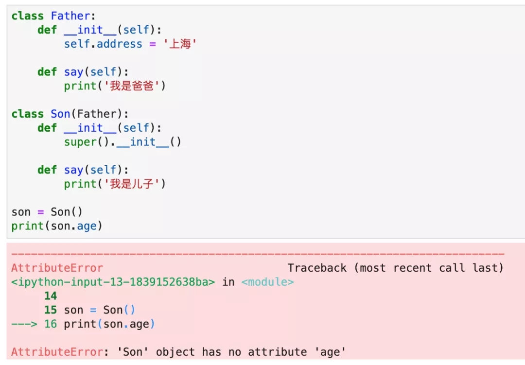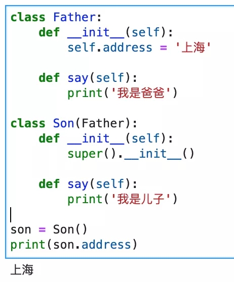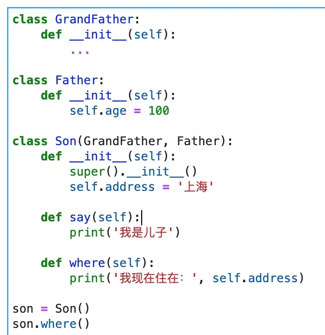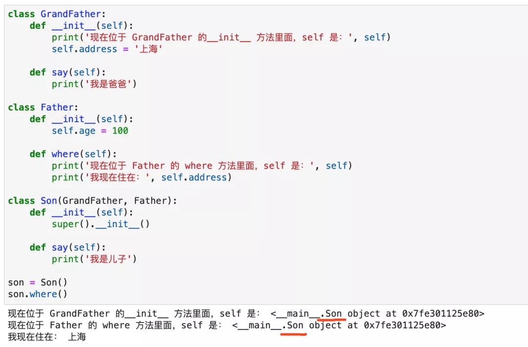大家注意畫紅線的地方, self 始終都是 Son 類的實(shí)例。所以,一開始初始化 .address 的時(shí)候,就是初始化的 Son 的實(shí)例的 .address 屬性。后面在 .where 里面調(diào)用 .address 的時(shí)候,也是讀取的 Son 的實(shí)例的 .address 屬性。所以,并不存在 Father 類去讀 GrandFather 類的情況。自始至終,都是 Son 類的實(shí)例在進(jìn)行各種操作。