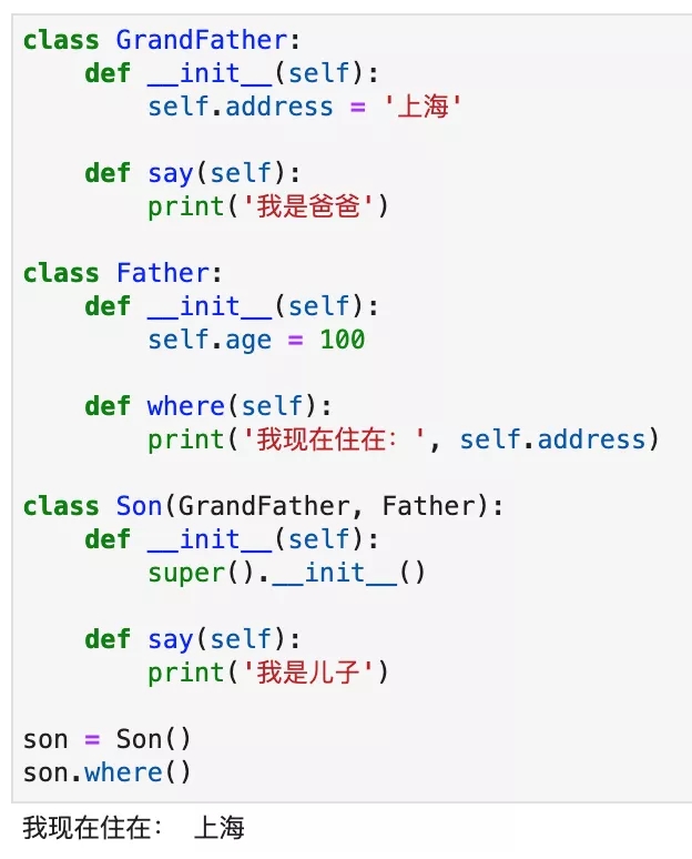 我們也知道,Python 是支持多繼承的,一個(gè)子類可以有多個(gè)父類。那么,大家請看下面這段代碼: