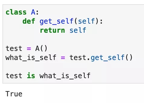 class A: def get_self(self): return self test = A() what_is_self = test.get_self() test is what_is_self