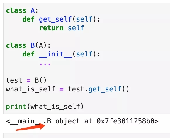 class A: def get_self(self): return self class B(A): def __init__(self): ... test = B() what_is_self = test.get_self() print(what_is_self)
