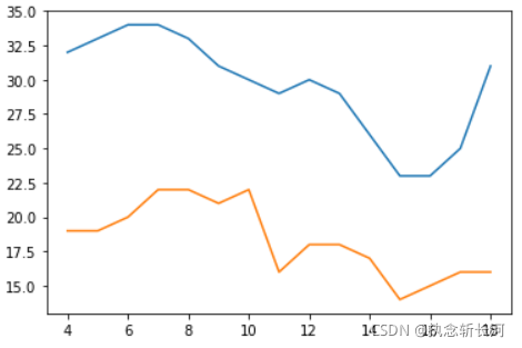 import matplotlib.pyplot as plt import numpy as np x = np.arange(4,19) y_max = np.array([32,33,34,34,33,31,30,29,30,29,26,23,23,25,31]) y_min = np.array([19,19,20,22,22,21,22,16,18,18,17,14,15,16,16]) # 繪制折線圖 plt.plot(x,y_max) plt.plot(x,y_min) plt.show()
