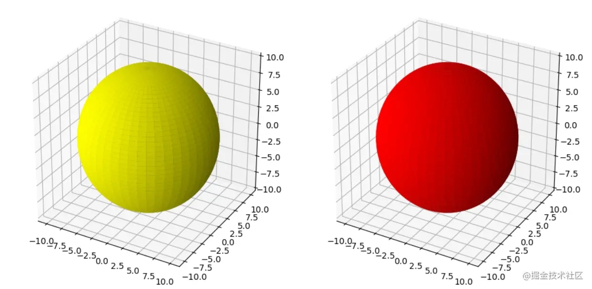 ax = fig.add_subplot(122, projection='3d') x = np.linspace(0, 2 * np.pi, 100) y = np.linspace(0, np.pi, 100) x1 = 10 * np.outer(np.cos(x), np.sin(y)) y1 = 10 * np.outer(np.sin(x), np.sin(y)) z = 10 * np.outer(np.ones(np.size(x1)), np.cos(y1)) ax.plot_surface(x1, y1, z, color='r')