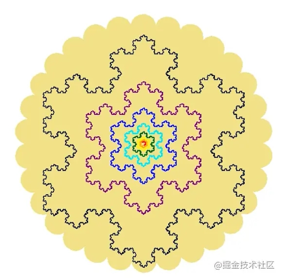 turtle.penup() turtle.goto(-200 * (4 / 7) ** (s - n), 100 * (4 / 7) ** (s - n)) # 每一次都是需要合理的等比例的擴大或是縮小 turtle.pendown() turtle.pensize(2) level = 5 koch(400 * (4 / 7) ** (s - n), level) # 大小是一個一個試出來的 # 不能超過setup的設定的范圍 600,不然就越界了 turtle.right(120) koch(400 * (4 / 7) ** (s - n), level) turtle.right(120) koch(400 * (4 / 7) ** (s - n), level) # 注意這里koch一次就要轉一次角度 turtle.right(120) turtle.hideturtle() # 隱藏畫筆 flower(n - 1)