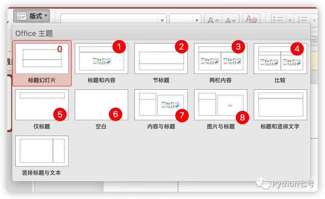 幻燈片都有板式,同樣的,pptx 提供了 9 種版式讓我們選擇,分別是: