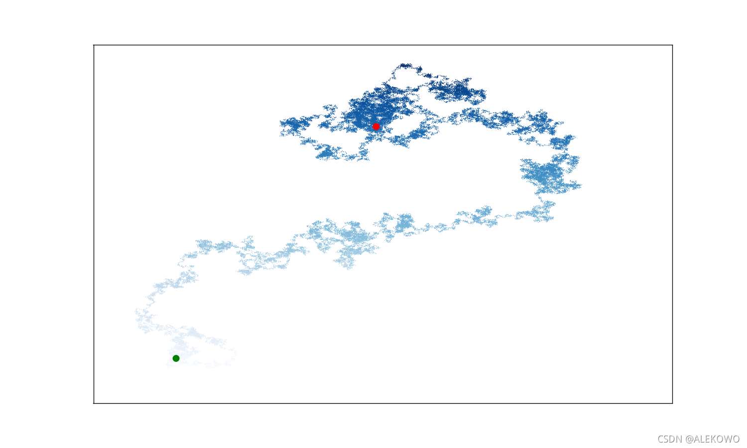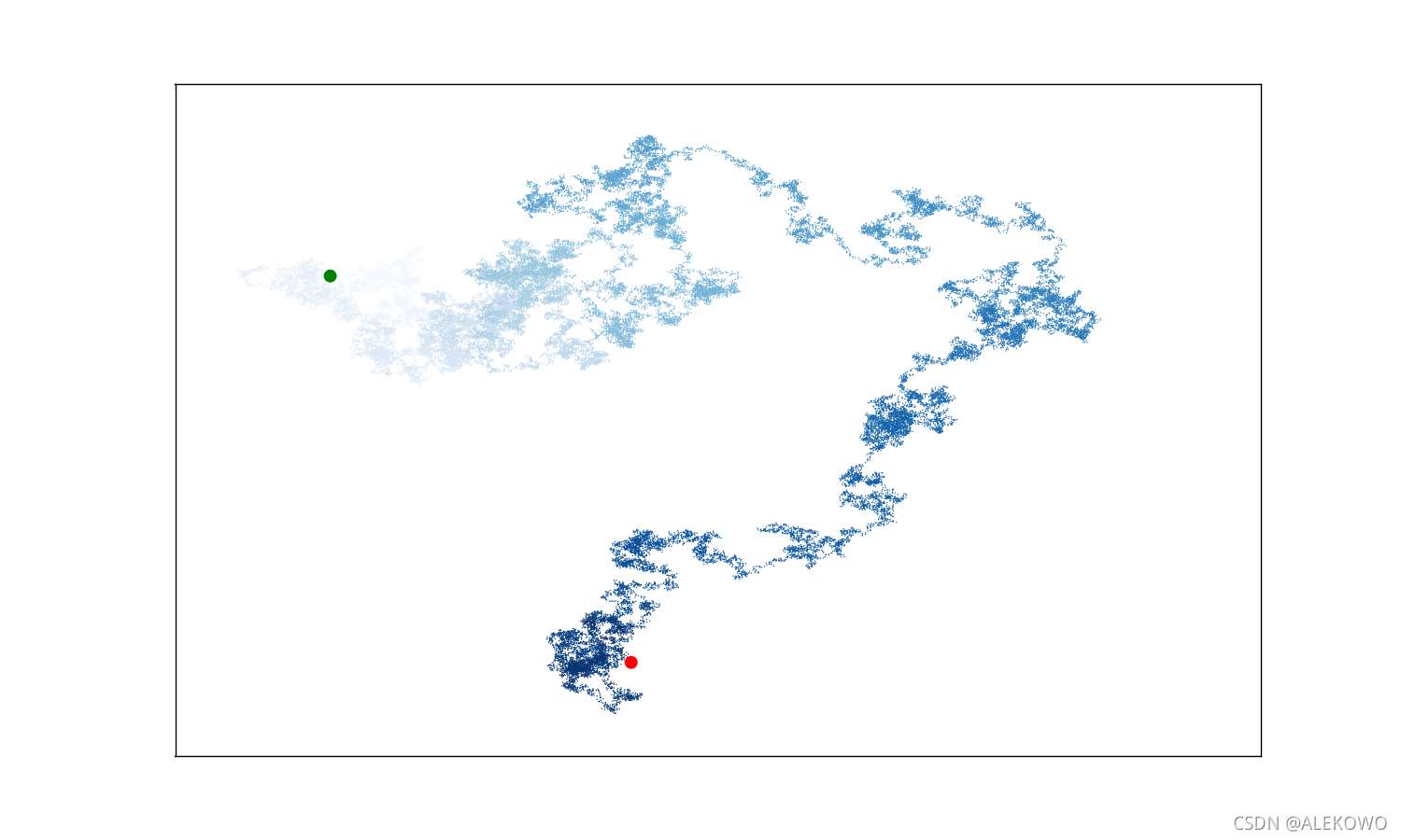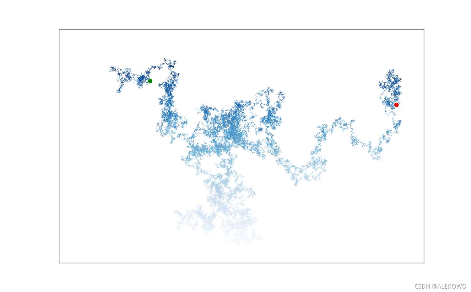 這里的y_values是由隨機(jī)漫步產(chǎn)生的,第一個點到最后一個點是連續(xù)變化的,這種隨機(jī)漫步會導(dǎo)致,第一個點到最后一個點的位置規(guī)律是有跡可循的(比如y值是從小到大變化的),局部看上去是隨機(jī)的,但是趨勢不是,趨勢是有規(guī)律的。
