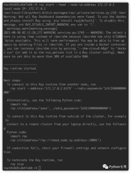 選擇在其中一個(gè)容器作為 head 節(jié)點(diǎn),這里選擇 172.17.0.2,執(zhí)行: