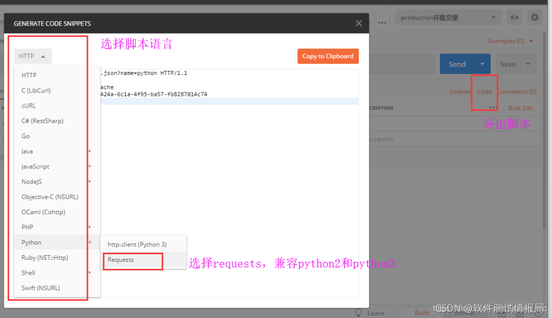 Postman的腳本可以導出多種語言的腳本,方便二次維護開發(fā)。