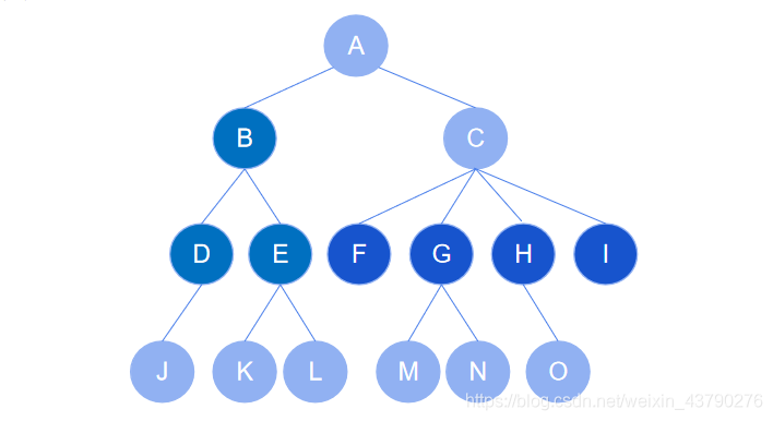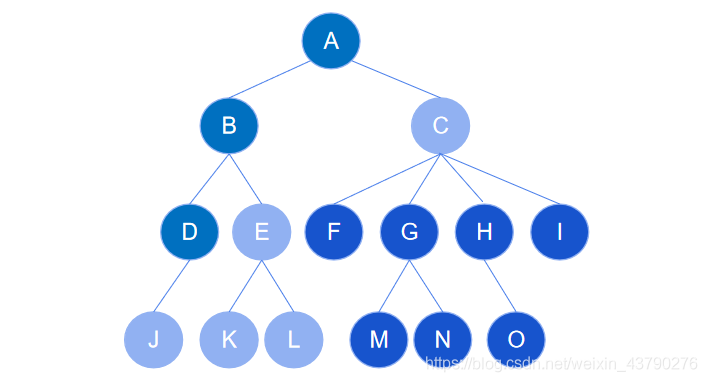 12. 葉節(jié)點(diǎn):又稱為終端節(jié)點(diǎn),度為零的節(jié)點(diǎn)被稱為葉節(jié)點(diǎn)。如下圖中,節(jié)點(diǎn) F,H,J,K,L,M,N,O 都是葉節(jié)點(diǎn)。