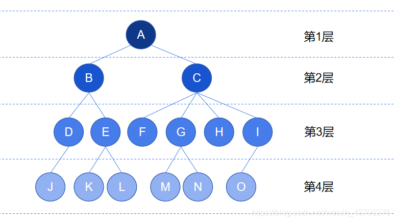 7. 節(jié)點(diǎn)的層次:從根開始定義起,根為第1層,根的子節(jié)點(diǎn)為第2層,以此類推。如下圖中,根節(jié)點(diǎn) A 在第1層,節(jié)點(diǎn) M 在第4層。