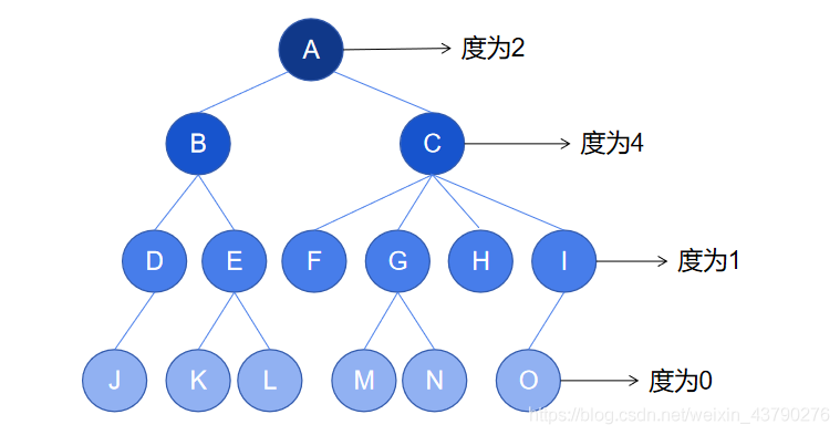 10. 節(jié)點(diǎn)的度:一個(gè)節(jié)點(diǎn)含有的子樹(或子節(jié)點(diǎn))的個(gè)數(shù)稱為該節(jié)點(diǎn)的度。如下圖中, 根節(jié)點(diǎn) A 的度為2,節(jié)點(diǎn) C 的度為4,節(jié)點(diǎn) I 的度為1,節(jié)點(diǎn) O 的度為 0 。