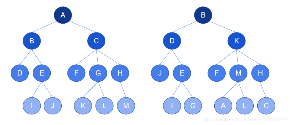 1. 無序樹:也稱為自由樹,樹中存在一個(gè)節(jié)點(diǎn),節(jié)點(diǎn)的子節(jié)點(diǎn)之間沒有順序關(guān)系。如下圖中,右邊的樹是無序樹,從樹中取一個(gè)節(jié)點(diǎn) D ,D 的子節(jié)點(diǎn)是節(jié)點(diǎn) J 和節(jié)點(diǎn) E,它們是沒有順序關(guān)系的,所以這是一棵無序樹。