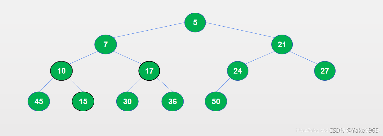 heap: [5, 7, 21, 15, 10, 24, 27, 45, 17, 30, 36, 50]