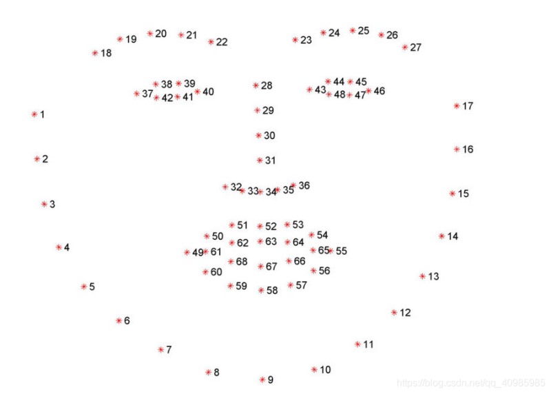 面部標(biāo)志檢測返回結(jié)果是:68個(gè)(x,y)坐標(biāo):