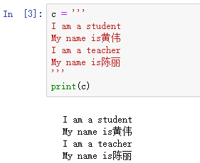c = ''' I am a student My name is黃偉 I am a teacher My name is陳麗 ''' print(c)