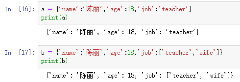 b = {'name':'陳麗','age':18,'job':['teacher','wife']}