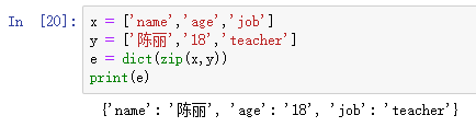 x = ['name','age','job'] y = ['陳麗','18','teacher'] e = dict(zip(x,y)) print(e)