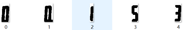 整體思路是這樣子的:0-9這10個(gè)數(shù)字也都是已經(jīng)被分割好的,并且保存好了,也就是模板,然后我們把待測(cè)的圖片也分割掉,然后從0-9模板文件夾中去讀取模板圖片,讓待測(cè)的分割完畢的圖片去和10個(gè)模板逐個(gè)相減,然后去統(tǒng)計(jì)他們相減后的像素和,如果這個(gè)在這10個(gè)中最低,那么他們就是同一個(gè)數(shù)字,然后輸出值就可以了,分割后的大概是這樣