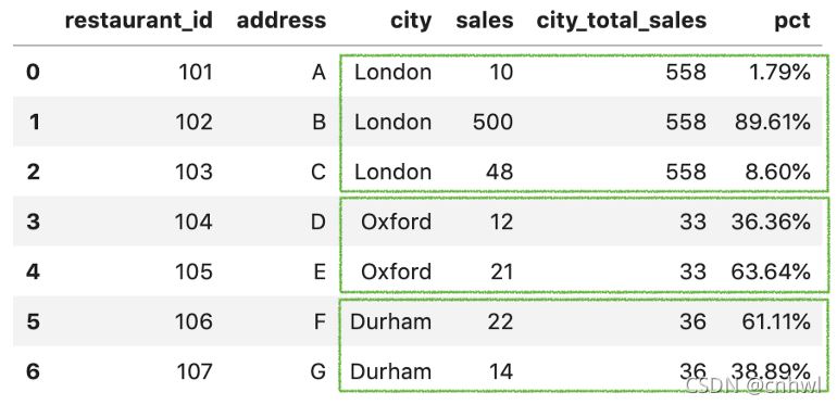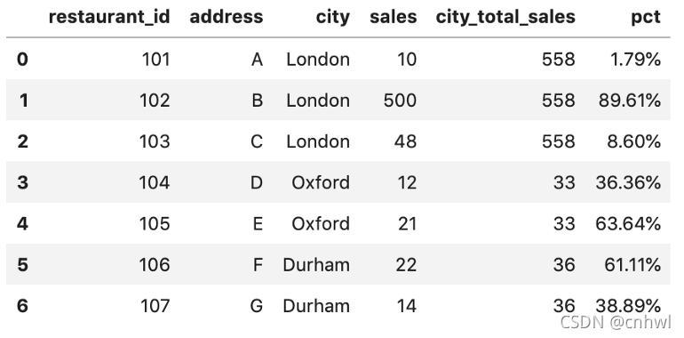 如果我們想知道:每個餐廳在城市中所占的銷售額百分比是多少?預期得到的輸出是: