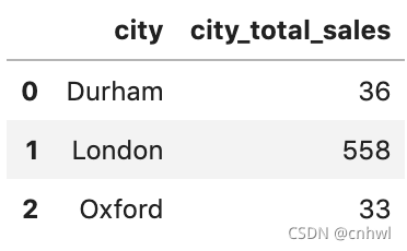 之后,新列被重命名為 city_total_sales 并且索引被重置(注意不能漏了 reset_index() ,因為 groupby('city') 生成的索引是城市,而我們希望城市作為普通列)。