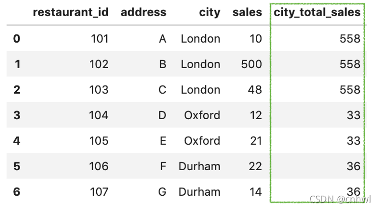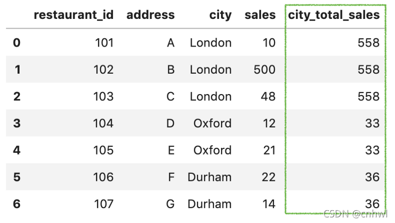 代碼翻譯過來就是:數(shù)據(jù)集基于城市進行分組,然后選定銷售額列,對每組的銷售額進行求和,返回一個和原列長度一樣的新列。